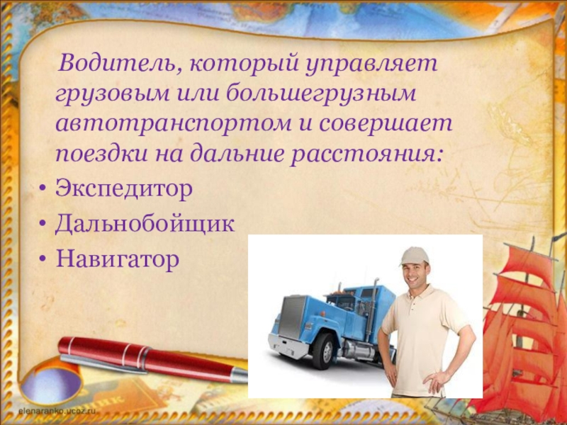 Слайд 15 Водитель, который управляет грузовым или большегрузным автотранспортом и совершает