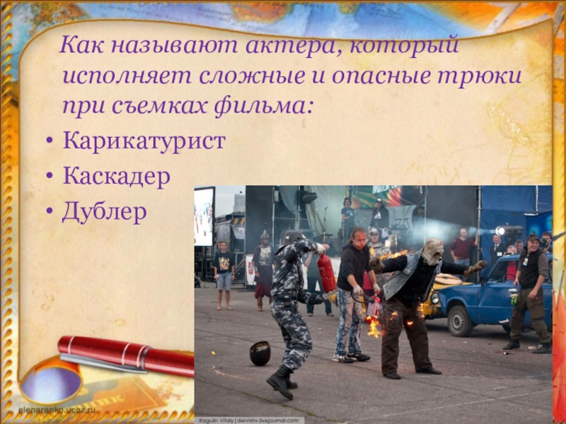 Слайд 14 Как называют актера, который исполняет сложные и опасные трюки