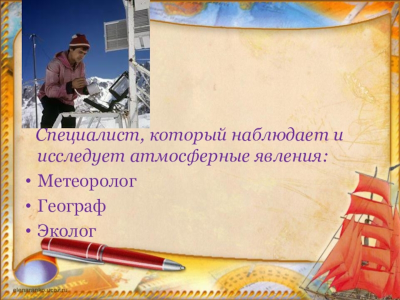 Слайд 12 Специалист, который наблюдает и исследует атмосферные явления: