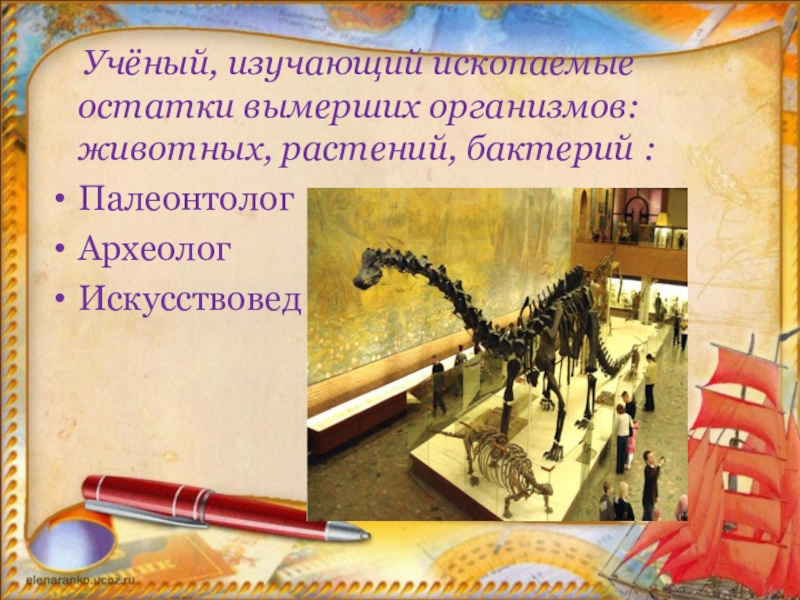 Учёный, изучающий ископаемые остатки вымерших организмов: животных, растений, бактерий : ПалеонтологАрхеологИскусствовед