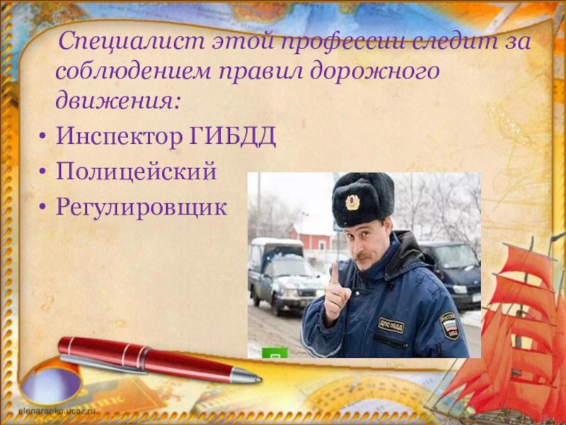 Слайд 8 Специалист этой профессии следит за соблюдением правил дорожного движения: