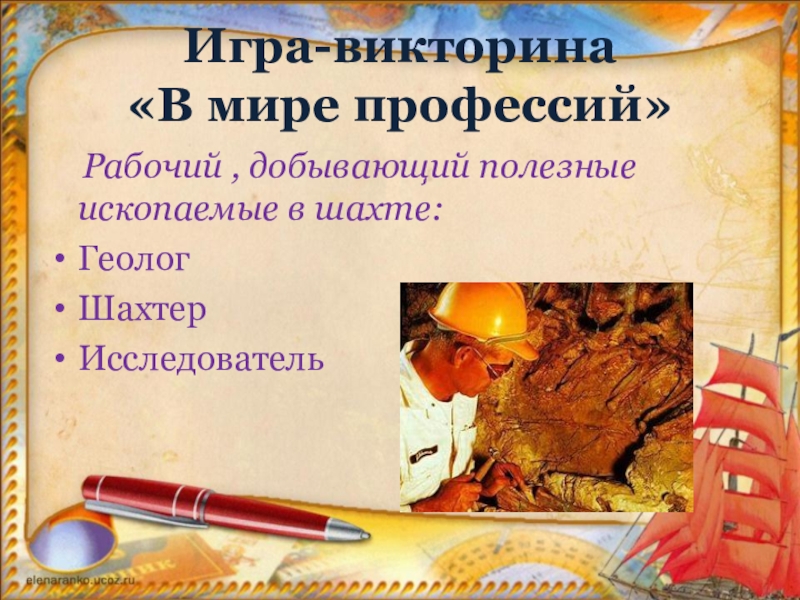 Игра-викторина  «В мире профессий»  Рабочий , добывающий полезные ископаемые в шахте:ГеологШахтерИсследователь