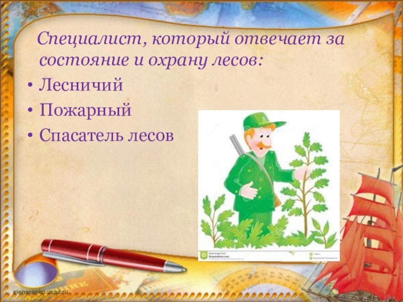 Слайд 10 Специалист, который отвечает за состояние и охрану лесов: