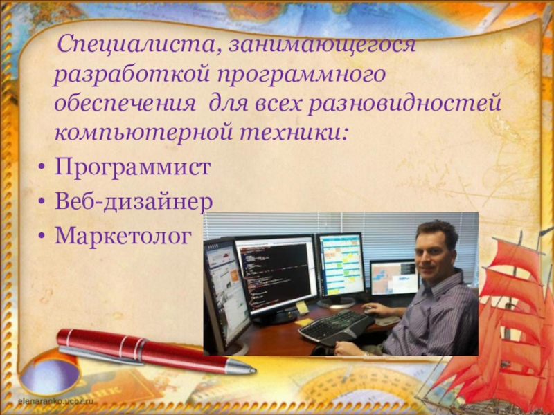 Слайд 13 Специалиста, занимающегося разработкой программного обеспечения для всех разновидностей компьютерной
