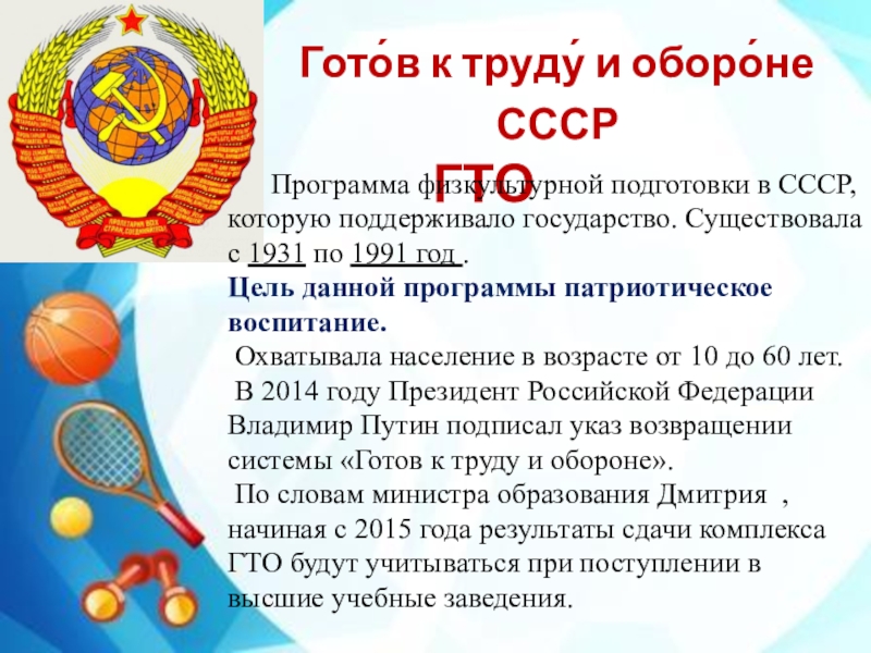 По словам министра образования Дмитрия , начиная с 2015 года результаты сдачи комплекса ГТО будут учитываться при поступлении в высшие учебные заведения.