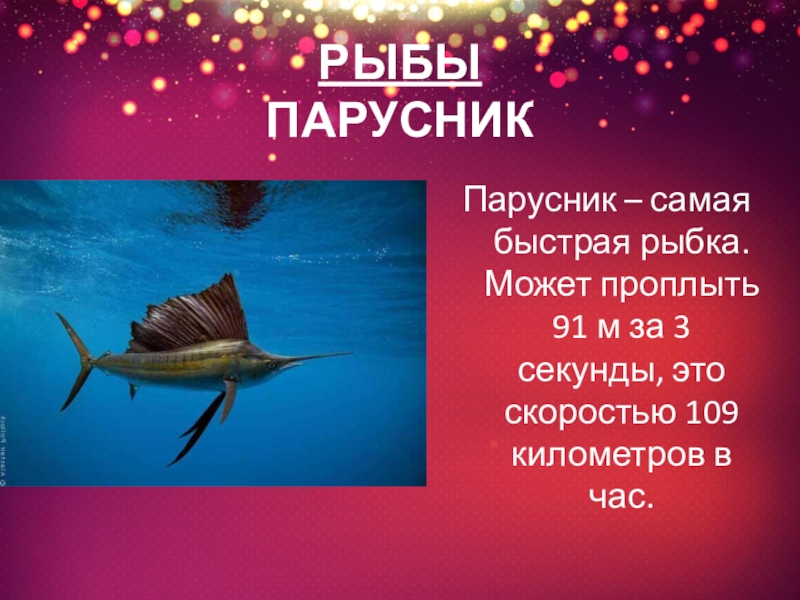 РЫБЫ ПАРУСНИКПарусник – самая быстрая рыбка. Может проплыть 91 м за 3 секунды, это скоростью 109 километров