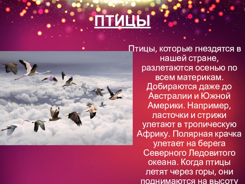 ПТИЦЫПтицы, которые гнездятся в нашей стране, разлетаются осенью по всем материкам. Добираются даже до Австралии и Южной