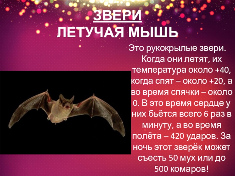ЗВЕРИ ЛЕТУЧАЯ МЫШЬЭто рукокрылые звери. Когда они летят, их температура около +40, когда спят – около +20,