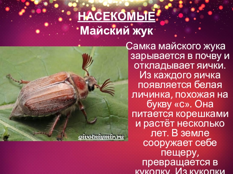 НАСЕКОМЫЕ Майский жукСамка майского жука зарывается в почву и откладывает яички. Из каждого яичка появляется белая личинка,