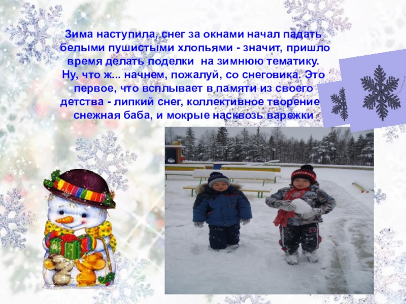 Зима наступила, снег за окнами начал падать белыми пушистыми хлопьями - значит, пришло время делать поделки на зимнюю тематику. Ну, что ж... начнем, пожалуй, со снеговика. Это первое, что всплывает в памяти из своего детства - липкий снег, коллективное творение - снежная баба, и мокрые насквозь варежки