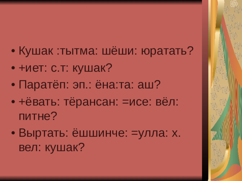 Кушак :тытма: шёши: юратать?+иет: с.т: кушак?Паратёп: эп.: ёна:та: аш?+ёвать: тёрансан: =исе: вёл: питне?Выртать: ёшшинче: =улла: х.вел: кушак?
