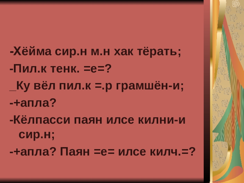 -Хёйма сир.н м.н хак тёрать;-Пил.к тенк. =е=?_Ку вёл пил.к =.р грамшён-и;-+апла?-Кёлпасси паян илсе килни-и сир.н;-+апла? Паян =е=