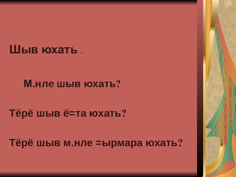 Шыв юхать .   М.нле шыв юхать?Тёрё шыв ё=та юхать?Тёрё шыв м.нле =ырмара юхать?