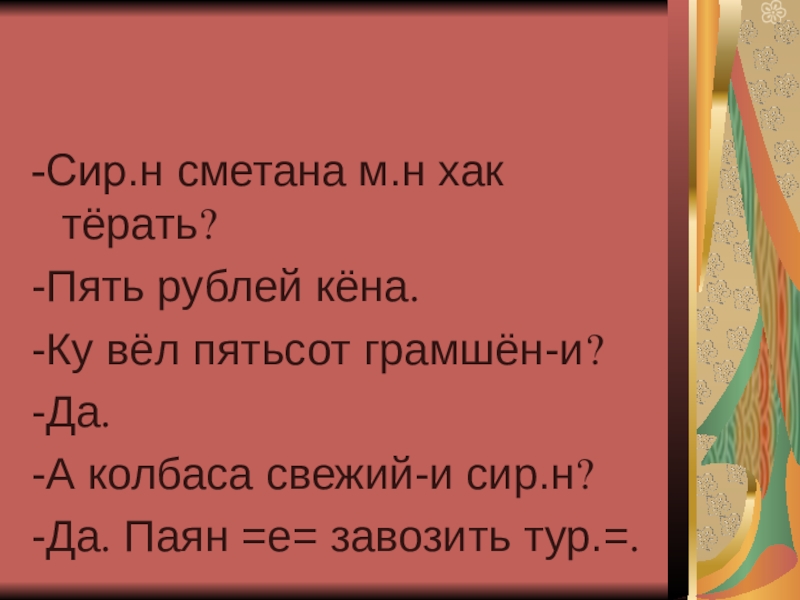 -Сир.н сметана м.н хак тёрать?-Пять рублей кёна.-Ку вёл пятьсот грамшён-и?-Да.-А колбаса свежий-и сир.н?-Да. Паян =е= завозить тур.=.