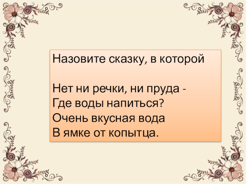 Назовите сказку, в которойНет ни речки, ни пруда -Где воды напиться?Очень вкусная водаВ ямке от копытца.