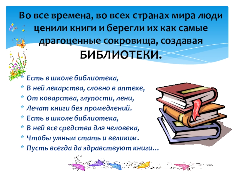 Во все времена, во всех странах мира люди ценили книги и берегли их как самые драгоценные сокровища, создавая БИБЛИОТЕКИ.