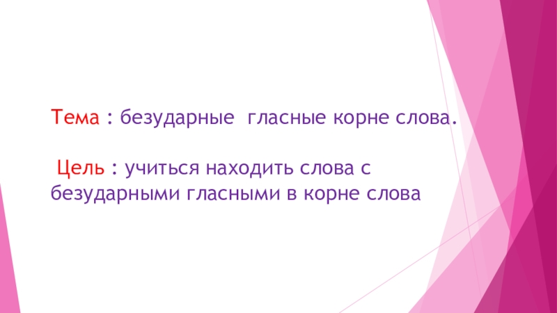 Тема : безударные гласные корне слова.   Цель : учиться находить слова с