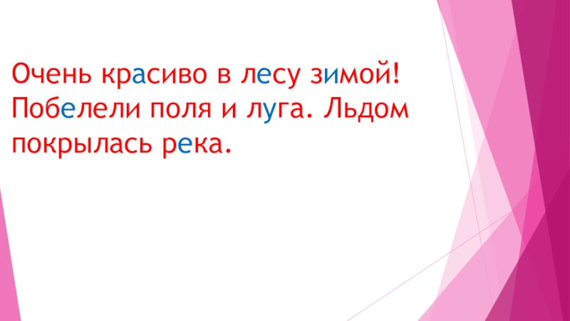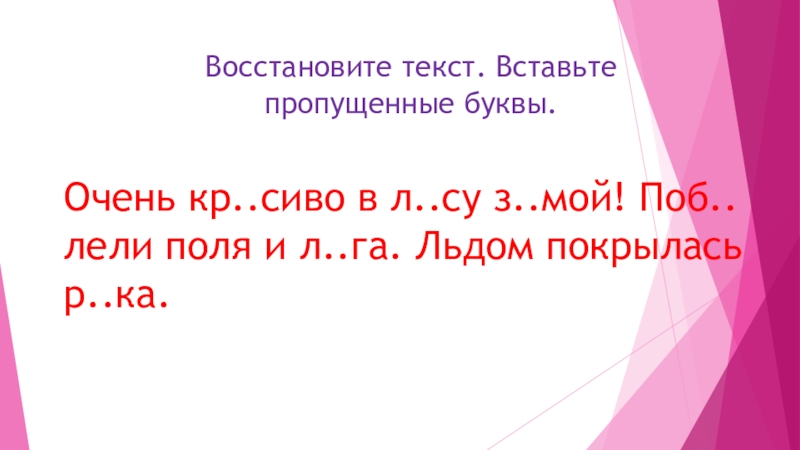 Восстановите текст. Вставьте пропущенные буквы. Очень кр..сиво в л..су з..мой! Поб..лели поля и л..га. Льдом покрылась р..ка.