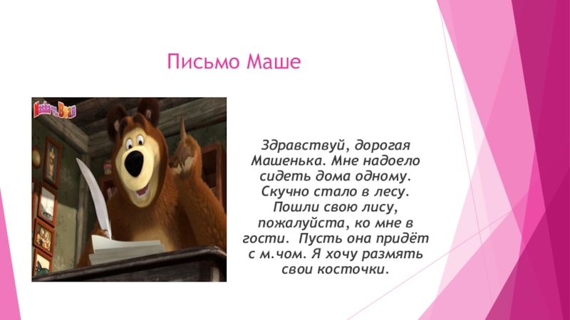 Письмо МашеЗдравствуй, дорогая Машенька. Мне надоело сидеть дома одному. Скучно стало в лесу. Пошли свою лису, пожалуйста,