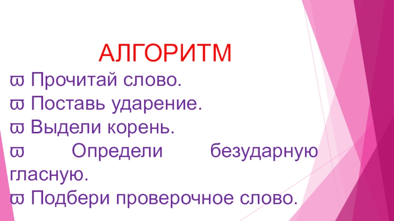 АЛГОРИТМ  Прочитай слово. Поставь ударение. Выдели корень. Определи безударную гласную. Подбери проверочное слово.