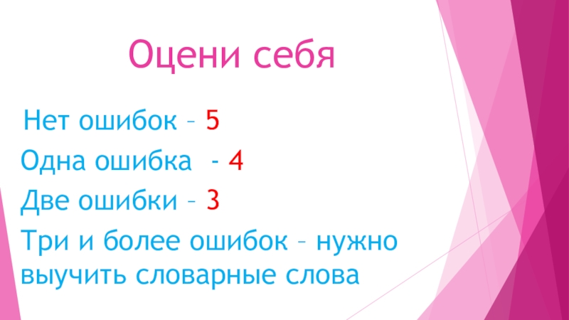 Оцени себя Нет ошибок – 5Одна ошибка - 4Две ошибки – 3Три и более ошибок – нужно