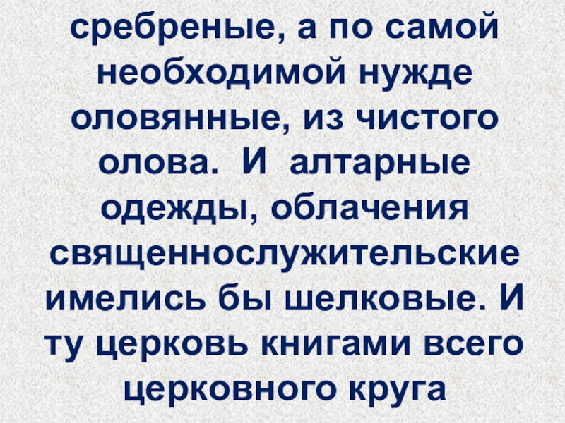 сребреные, а по самой необходимой нужде оловянные, из чистого олова. И алтарные одежды, облачения священнослужительские имелись бы