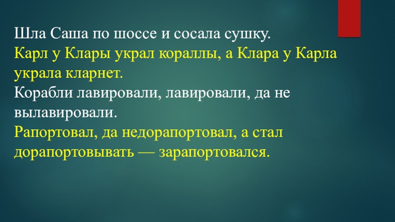 Слайд 11Шла Саша по шоссе и сосала сушку. Карл у Клары украл кораллы,