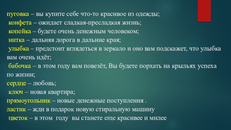 Слайд 12пуговка – вы купите себе что-то красивое из одежды; конфета –
