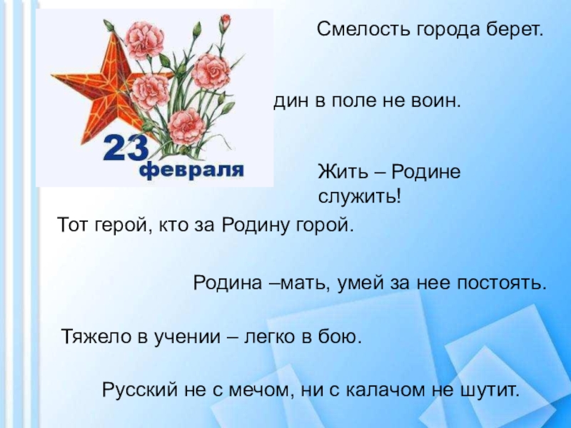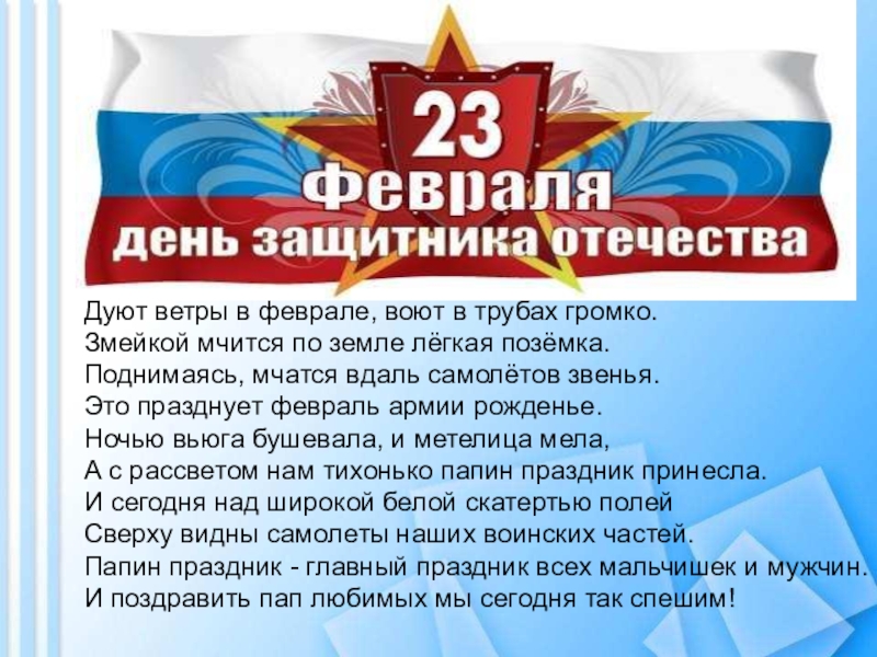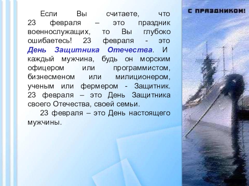 23 февраля – это праздник военнослужащих, то Вы глубоко ошибаетесь! 23 февраля - это День Защитника Отечества. И каждый мужчина, будь он морским офицером или программистом, бизнесменом или милиционером, ученым или фермером - Защитник. 23 февраля – это День Защитника своего Отечества, своей семьи.
