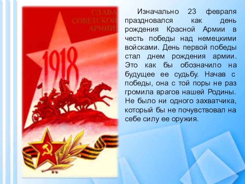 Слайд 14 Изначально 23 февраля праздновался как день рождения Красной Армии в честь