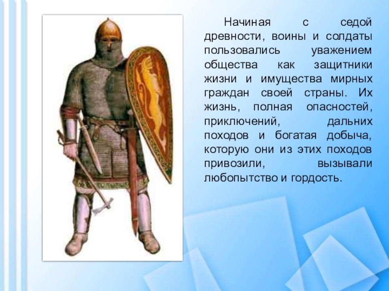 Слайд 8 Начиная с седой древности, воины и солдаты пользовались уважением общества как