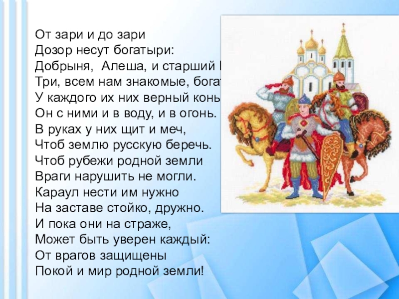 Слайд 7 В древние времена боролись с врагами богатыри. Вот какие были смелые защитники Отечества.