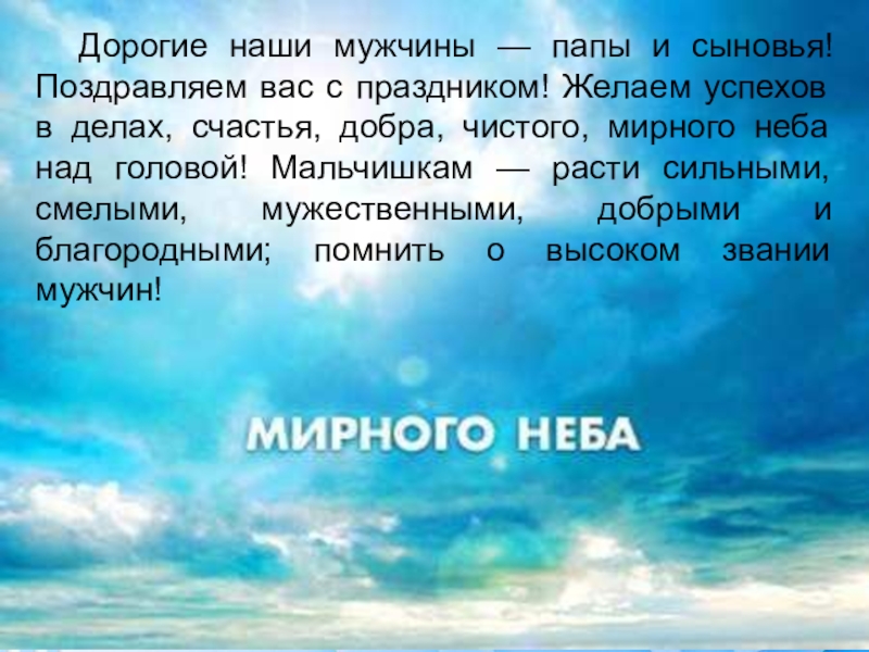 Желаем успехов в делах, счастья, добра, чистого, мирного неба над головой! Мальчишкам — расти сильными, смелыми, мужественными, добрыми и благородными; помнить о высоком звании мужчин!