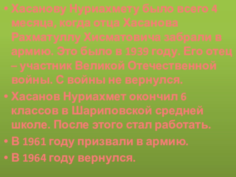 Слайд 15Хасанову Нуриахмету было всего 4 месяца, когда отца Хасанова Рахматуллу Хисматовича