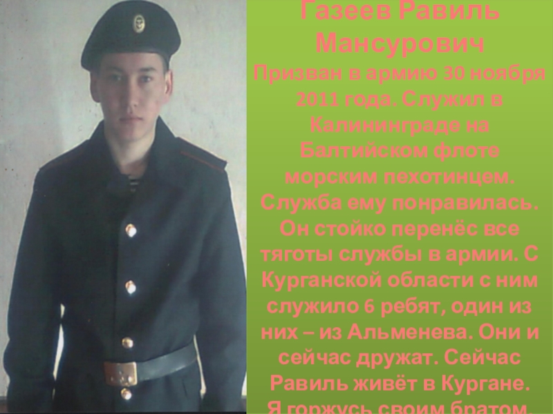 Служба ему понравилась. Он стойко перенёс все тяготы службы в армии. С Курганской области с ним служило 6 ребят, один из них – из Альменева. Они и сейчас дружат. Сейчас Равиль живёт в Кургане.