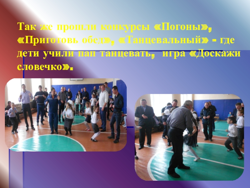 Так же прошли конкурсы «Погоны», «Приготовь обед», «Танцевальный» - где дети учили пап танцевать, игра «Доскажи словечко».