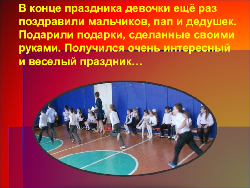 Слайд 8 В конце праздника девочки ещё раз поздравили мальчиков, пап