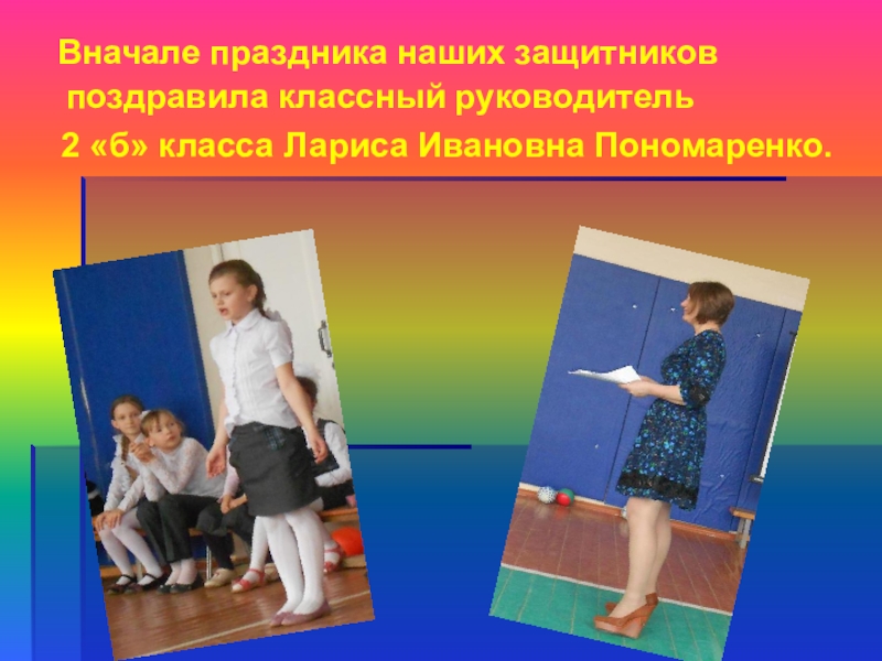 Вначале праздника наших защитников поздравила классный руководитель  2 «б» класса Лариса Ивановна Пономаренко.