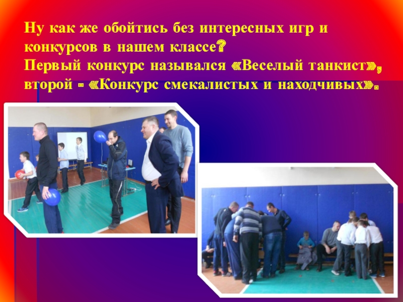 классе? Первый конкурс назывался «Веселый танкист», второй - «Конкурс смекалистых и находчивых».