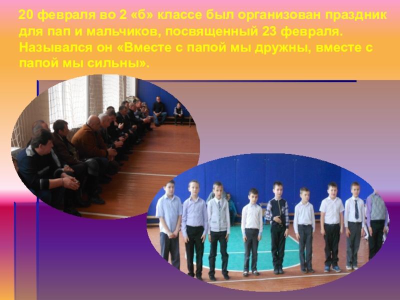 20 февраля во 2 «б» классе был организован праздник для пап и мальчиков, посвященный 23 февраля. Назывался он «Вместе с папой мы дружны, вместе с папой мы сильны».