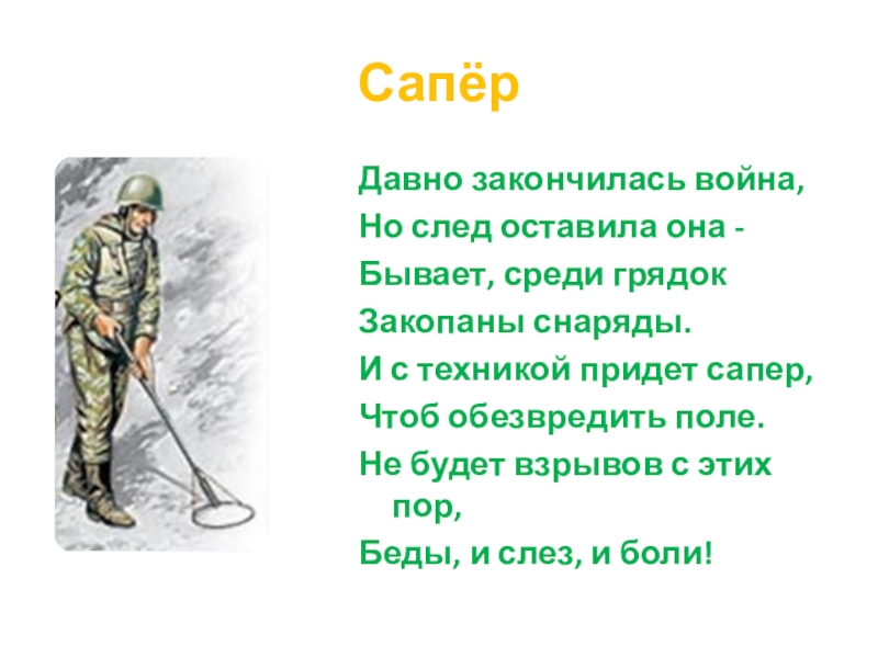 СапёрДавно закончилась война, Но след оставила она - Бывает, среди грядок Закопаны снаряды. И с техникой придет сапер, Чтоб обезвредить поле. Не будет