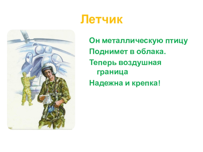 Летчик Он металлическую птицу Поднимет в облака. Теперь воздушная граница Надежна и крепка!