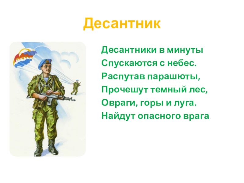ДесантникДесантники в минуты Спускаются с небес. Распутав парашюты, Прочешут темный лес, Овраги, горы и луга. Найдут опасного врага.