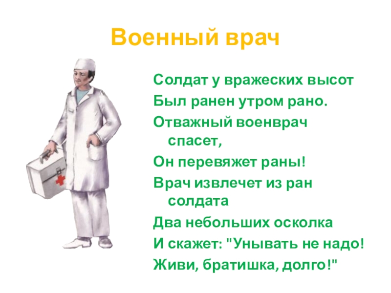 Военный врачСолдат у вражеских высот Был ранен утром рано. Отважный военврач спасет, Он перевяжет раны! Врач извлечет из ран солдата Два небольших