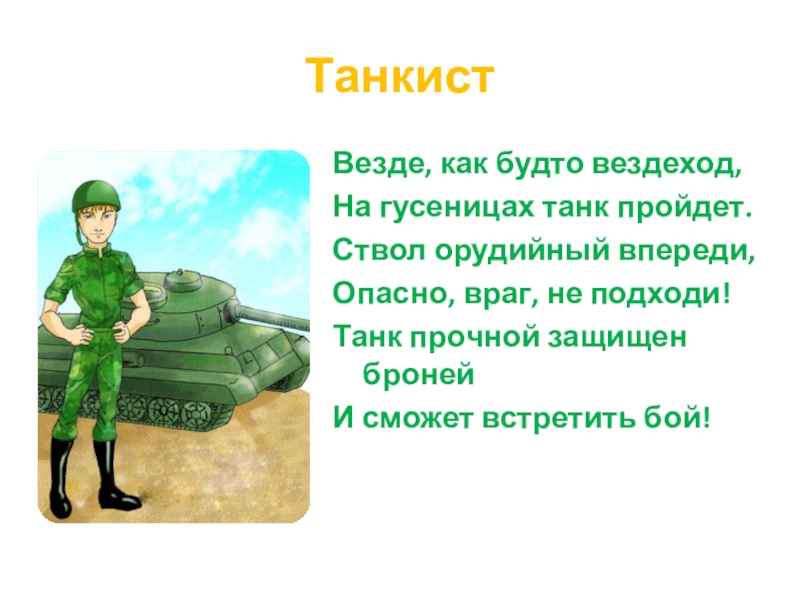 ТанкистВезде, как будто вездеход, На гусеницах танк пройдет. Ствол орудийный впереди, Опасно, враг, не подходи! Танк прочной защищен броней И сможет встретить