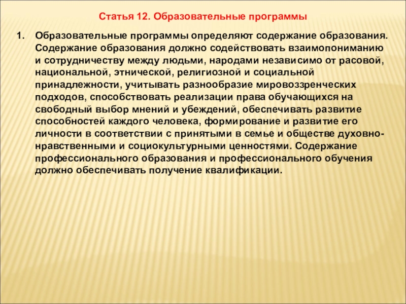 содействовать взаимопониманию и сотрудничеству между людьми, народами независимо от расовой, национальной, этнической, религиозной и социальной принадлежности, учитывать разнообразие мировоззренческих подходов, способствовать реализации права обучающихся на свободный выбор мнений и убеждений, обеспечивать развитие способностей каждого человека, формирование и развитие его личности в соответствии с принятыми в семье и обществе духовно-нравственными и социокультурными ценностями. Содержание профессионального образования и профессионального обучения должно обеспечивать получение квалификации.