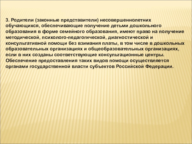 в форме семейного образования, имеют право на получение методической, психолого-педагогической, диагностической и консультативной помощи без взимания платы, в том числе в дошкольных образовательных организациях и общеобразовательных организациях, если в них созданы соответствующие консультационные центры. Обеспечение предоставления таких видов помощи осуществляется органами государственной власти субъектов Российской Федерации.