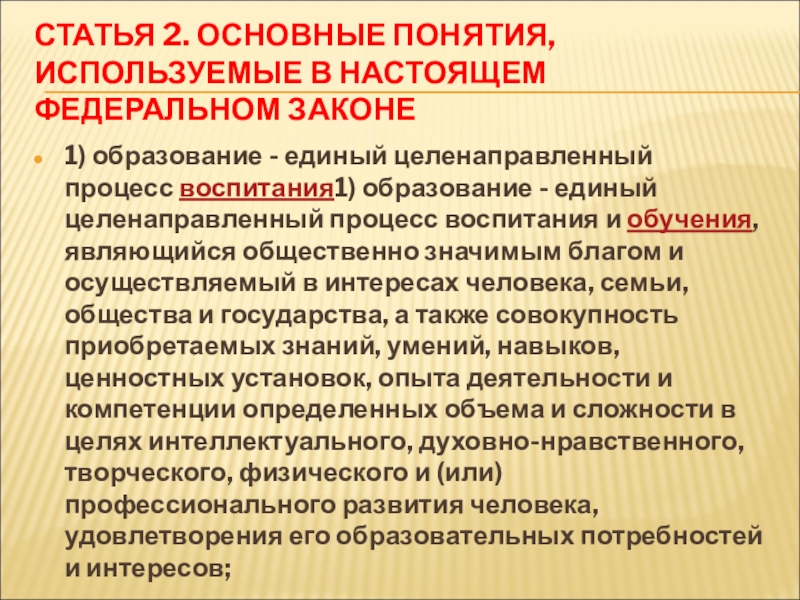 единый целенаправленный процесс воспитания и обучения, являющийся общественно значимым благом и осуществляемый в интересах человека, семьи, общества и государства, а также совокупность приобретаемых знаний, умений, навыков, ценностных установок, опыта деятельности и компетенции определенных объема и сложности в целях интеллектуального, духовно-нравственного, творческого, физического и (или) профессионального развития человека, удовлетворения его образовательных потребностей и интересов;