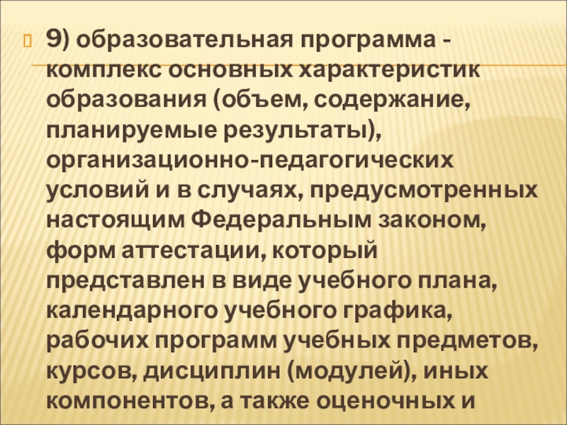 Слайд 59) образовательная программа - комплекс основных характеристик образования (объем, содержание, планируемые результаты), организационно-педагогических