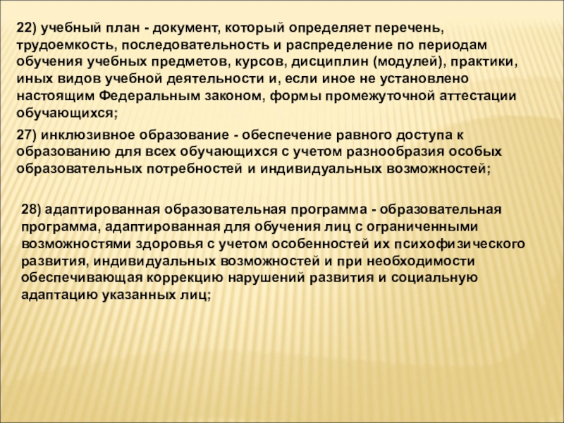 28) адаптированная образовательная программа - образовательная программа, адаптированная для обучения лиц с ограниченными возможностями здоровья с учетом особенностей их психофизического развития, индивидуальных возможностей и при необходимости обеспечивающая коррекцию нарушений развития и социальную адаптацию указанных лиц;